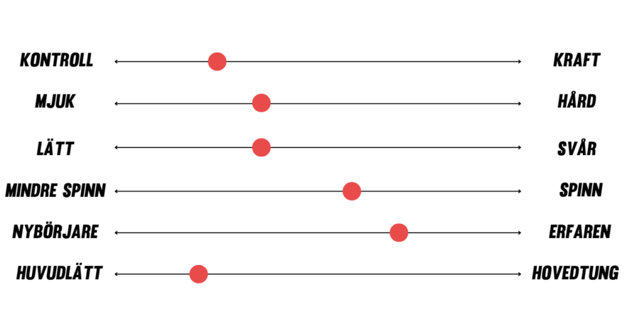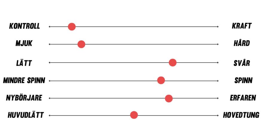 Lätt vs. Svår: Berättar hur svårt racketen är att spela med. Vanligtvis säger man att en mindre sweetspot gör racketet svårare att spela med, eftersom du måste träffa sweetspoten för att träffa bollen rent.